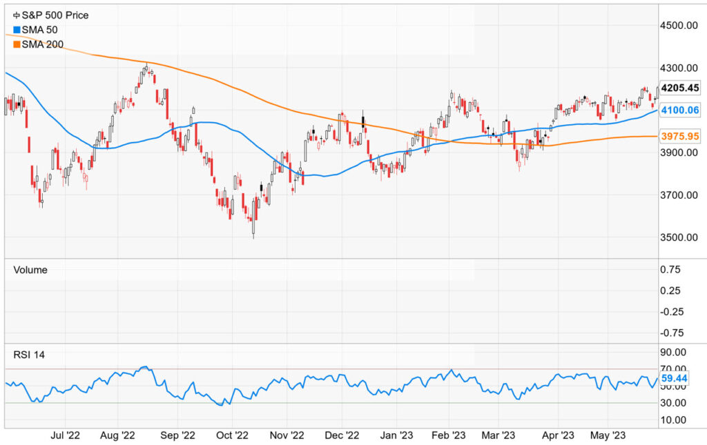 As investors awaited news from the debt ceiling negotiations, markets continued to ebb and flow. The S&P 500 continued to trade range-bound, oscillating between 4100 and 4200. Fed rhetoric continued to open