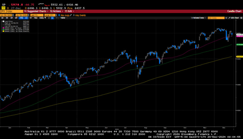 The final trading sessions for 2024 extended losses from the prior week, but the S&P 500 and NASDAQ still posted impressive gains for the year, 23.3% and 28.6%, respectively. The so-called Santa